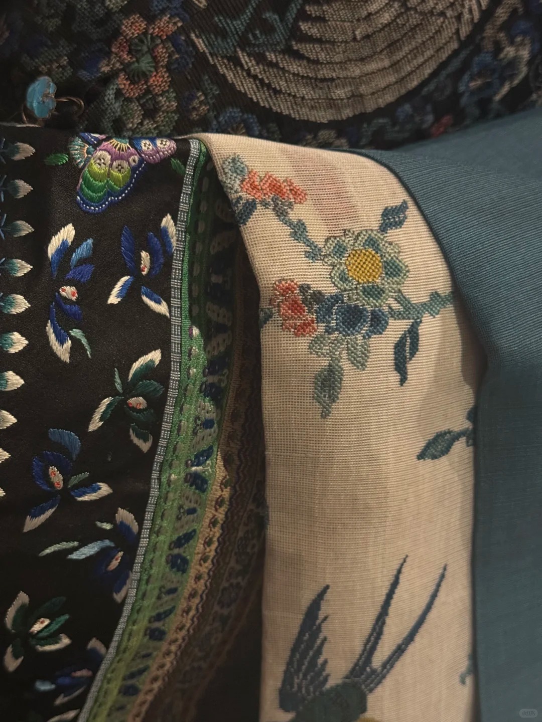 细节:服饰上有大量精美的刺绣装饰,图案包括凤凰、花卉、鸟类(如燕子)、蝴蝶等。凤凰图案造型精美,羽毛等细节刻画细致,周围环绕着色彩艳丽的花卉,栩栩如生;花卉图案色彩丰富,有红、蓝、黄等多种颜色,花瓣、花蕊等细节清晰;还有灵动的鸟类、蝴蝶刺绣,为服饰增添了灵动之感。同时,衣袖等部分采用多层不同面料拼接、装饰的工艺,边缘处也有精致的纹样点缀,处处体现出精湛的工艺。