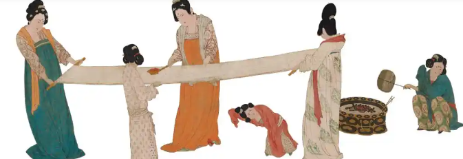 盛唐,长安是全国的丝织品生产中心,都城内有少府监、织染署、掖庭局等机构,下设官营丝绸作坊。玄宗后期,宫中专为杨贵妃造作锦秀金玉之工就达千人。官府作坊内也有为数不少的奴婢,一些技艺出众的被分配到掖庭局劳作,所得报酬仅为日常衣食。《捣练图》中所描绘的劳作景象,真实再现了她们的生活。