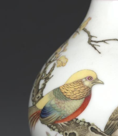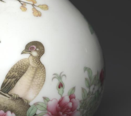 在清代,粉彩瓷器以其精美的工艺深受宫廷喜爱。这种蒜头瓶常被陈设于宫廷的宫殿、 居室之中,摆放在多宝格、条案等地方。瓶身精美的花鸟纹饰、柔和绚丽的色彩, 为庄重威严的宫廷环境增添了一抹灵动雅致的气息,彰显皇家的富贵与审美品味。