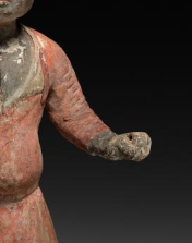 本品规格为21 x 8.3 厘米。俑为站立姿态,整体造型生动。人物头戴圆形帽子,面部五官刻画颇具异域特色,神情鲜活。身着带有彩绘的服饰,虽历经岁月,部分色彩有所斑驳,但仍能看出服饰的样式与色彩搭配,展现出唐代胡人服饰的特点。人物姿态独特,一只手臂抬起,似在进行某种动作,姿态富有动感与生活气息。俑的制作工艺精湛,通过塑造与彩绘,将唐代胡人形象鲜活呈现,是研究唐代中外文化交流、服饰艺术等方面的重要实物资料,具有较高的历史与艺术价值。