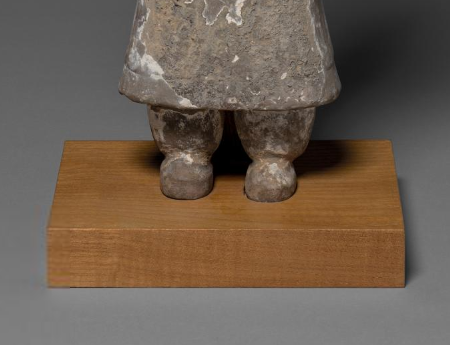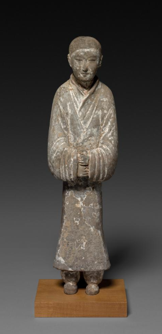 本品规格为54.9 厘米。为西汉陶制雕塑。以灰陶为材质,呈站立姿态,人物头戴小冠,身着长袍,衣纹简洁。双手拱手于身前,造型古朴写实,虽历经岁月,仍可窥见西汉陶俑塑造风格,是研究西汉丧葬文化、雕塑艺术及服饰风貌的实物,反映当时社会对丧葬明器的制作审美与工艺水平 。