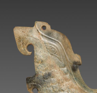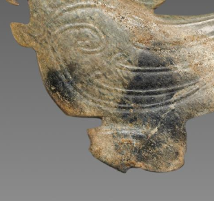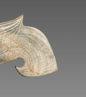 本品规格为11.2 厘米。以玉为材,受沁呈古朴色泽,包浆厚重。整体雕琢成凤鸟形态,线条流畅,轮廓优美。凤首微昂,喙部精巧,眼部刻画细致,羽翼以阴刻线勾勒,纹理清晰,展现羽毛层次。尾部舒展,造型灵动。顶端有穿孔,便于系佩。其工艺精湛,将凤鸟的神姿与西周玉器的典雅融合,是研究西周玉器造型、工艺及凤鸟文化的重要实物,承载西周艺术审美与精神寓意 。