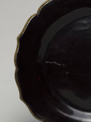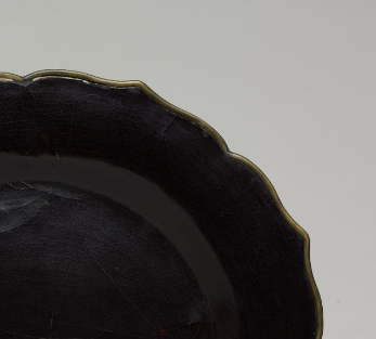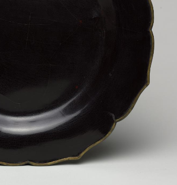 本品规格为26.8 厘米。盘口呈菱花形,边缘线条曲折灵动,增添了器物的艺术感。盘身以黑漆髹饰,漆面虽历经岁月,带有一些细微的裂纹,却更显古朴沧桑,仿佛承载着历史的痕迹。黑漆色泽深沉浓郁,在光线映照下,泛着温润的光泽,展现出漆器特有的质感。口沿处还带有金属包边,既起到了保护器物的作用,又与黑漆形成色彩和材质的对比,让整个盘子在沉稳中多了一份精致。