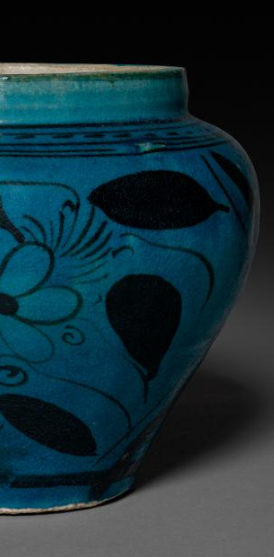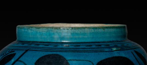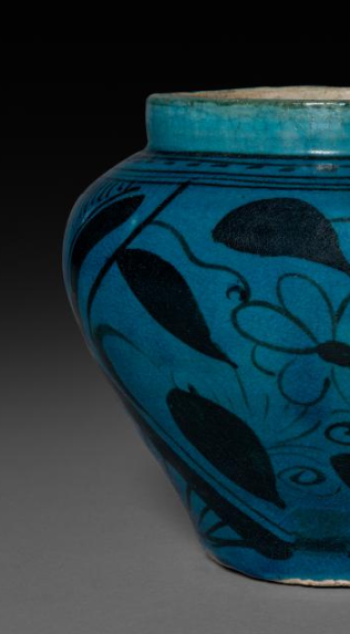 本品规格为直径14.4厘米,高度12.2厘米。罐体呈敛口、鼓腹、平底造型,施蓝釉为地,以黑彩绘制花卉、叶片等纹饰,蓝釉色泽浓郁,黑彩线条流畅,纹饰布局疏密得当,呈现出元代瓷器装饰的独特风格,反映元代制瓷工艺在釉色与彩绘结合上的探索,是研究元代陶瓷艺术、装饰技法及审美取向的实物,见证元代瓷器的艺术魅力 。