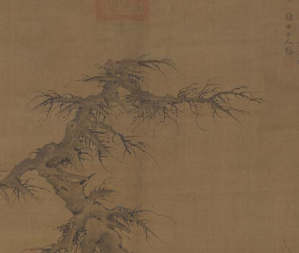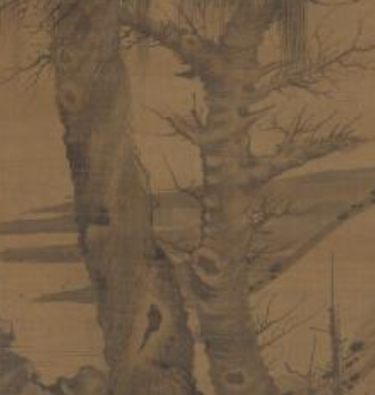 本品规格为165.7 x 108.6 厘米。以绢本为载体,展现出冬日山林的清冷景致。画面中,几株枯树挺立,枝干虬曲,细枝稀疏,似在寒风中兀立,尽显苍劲孤寂之态。树木周围,坡石错落,部分覆有薄雪,更添寒意。远处隐约可见的林木与天空,色调朦胧,营造出悠远空寂的氛围。用笔上,线条简练而富有质感,通过对枯树枝干、坡石轮廓的勾勒,以及淡墨等技法的运用,精准地表现出雪景中寒林的萧索与静谧。整体构图简洁却层次分明,将元代山水画注重意境营造、追求笔墨简淡空灵的特点体现得较为充分,传递出冬日山林间清冷、孤寂且悠远的意境,给人以沉静肃穆之感。