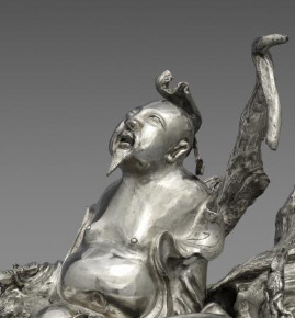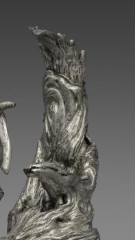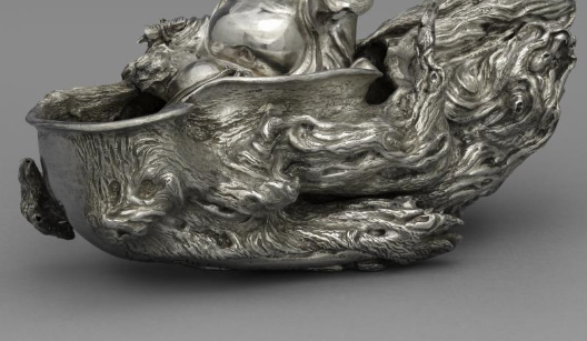 本品规格为16 厘米。呈现仙人乘槎的经典题材,仙人袒胸露腹,神态悠然,端坐于槎形载体之上。槎身造型仿自然枯木,纹理扭曲盘绕,细节生动,营造出仙人乘槎遨游的奇幻意境,整体造型独特且富有想象力。以银为材,采用铸造、雕刻等工艺。银质温润,经精细处理,仙人的面部表情、衣饰褶皱,以及槎身的木纹肌理,都刻画入微,工艺精湛,体现元代工匠对材质的把控与高超技艺,将神话题材转化为立体艺术。