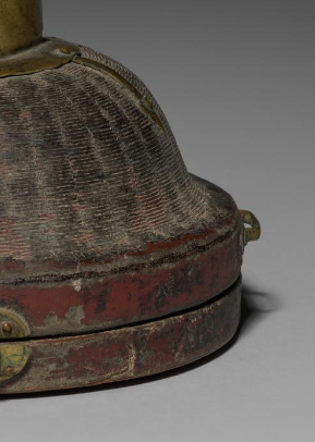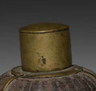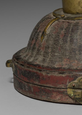 本品规格为16.6 x 17.8 厘米。主体部分采用竹编工艺,竹篾编织紧密,虽历经岁月,仍能看出其原本的纹理与工艺的精细,外层还带有红色漆痕残留,增添了古朴的质感。炉身顶部镶嵌有铜质的圆柱形构件,色泽为古朴的铜黄色,与竹编部分形成材质和色彩的对比。边缘处也有铜质镶边加固,同时配有铜质的锁扣等构件,既起到实用的闭合作用,又在装饰上与竹编部分相呼应,整体兼具实用性与一定的工艺美感,展现出元代器物在材质结合与工艺制作上的特点,是当时兼具保暖功能与装饰性的生活器具。