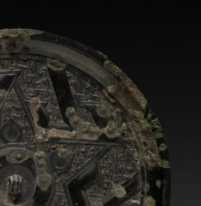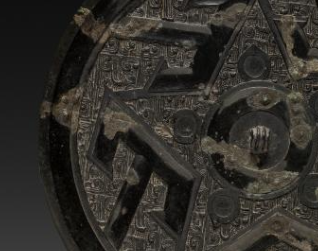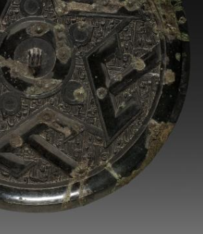 本品规格为18厘米。圆形,以青铜铸造,表面呈幽黑包浆,局部锈迹斑驳,显岁月痕迹。镜背纹饰布局规整,中心设纽,周围以几何线条构成对称图案,线条硬朗,棱角分明,似山字等造型,辅以细密地纹,层次丰富。整体风格古朴神秘,几何纹组合彰显战国时期工匠的设计巧思与铸造技艺,是研究战国铜镜艺术、工艺水平及审美观念的重要实物,承载战国文化与技术信息 。