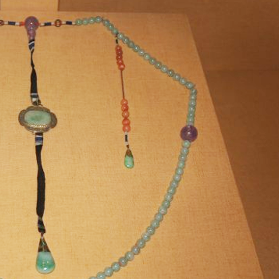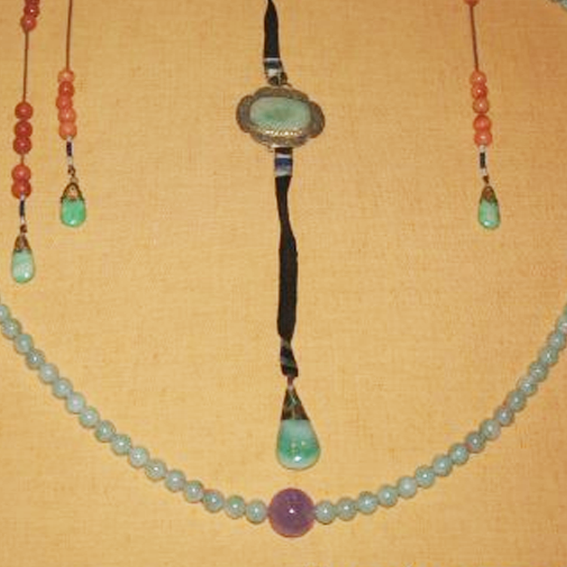 材质与色泽:主链珠子多为淡绿色,可能是翡翠珠,色泽温润;间隔分布着紫色的宝石珠、红色的珊瑚珠,色彩对比鲜明。绦带为黑色,坠角部分有绿色的玉石等材质,在金属装饰的衬托下,显得典雅华贵。