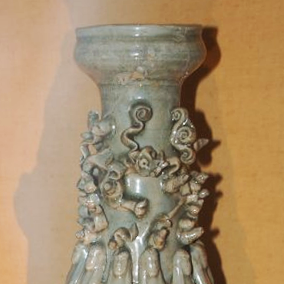 细节:瓶颈处的堆塑十分精美,塑有众多人物形象,人物姿态各异,周围还搭配有龙、云纹等装饰,展现出当时高超的雕塑技艺和制瓷工艺水平;瓶身与瓶颈的连接处有一圈卷曲的花纹装饰,增添了器物的美感。
