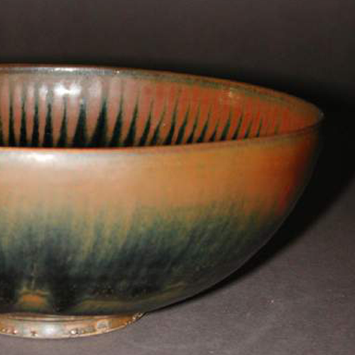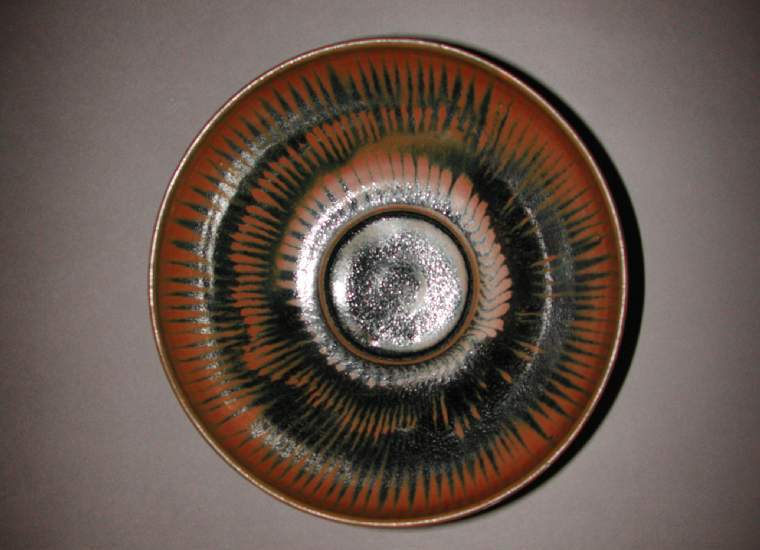 材质与色泽:以瓷土为胎,胎体厚重,呈深灰色或黑色,俗称 “铁胎”。盏内外施柿釉,釉色丰富,从盏口至盏底,呈现出由橙红到深褐再到近黑色的渐变效果,如同秋日成熟的柿子色泽。釉面分布着细密的兔毫纹,从盏口向下放射状分布,形如兔子身上的毫毛,在光线照射下,闪烁着金属光泽,极具美感。