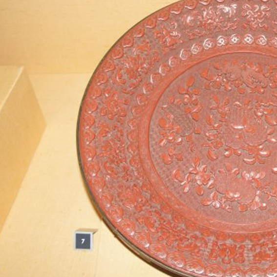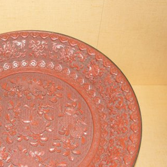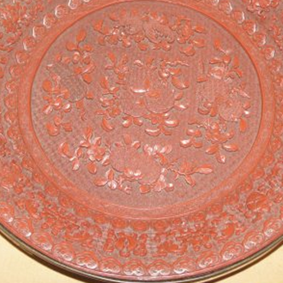 细节:盘面上雕刻着精美的花卉纹饰,花卉形态各异,有盛开的花朵、卷曲的枝叶,布局疏密有致。雕刻工艺精湛,刀法细腻,花纹具有立体感,展现出当时高超的剔红技艺。盘的边缘也装饰有一圈连续的花卉或几何图案,进一步增加了器物的精致感。