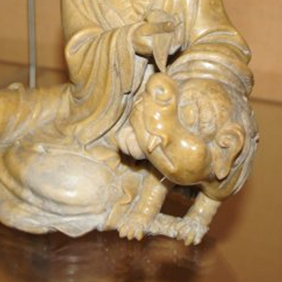 细节:雕刻工艺精湛,罗汉的面部表情刻画入微,皱纹、胡须等细节清晰可见,展现出罗汉的睿智与祥和。身上的衣衫纹理流畅,自然下垂,富有质感。老虎的毛发、牙齿、神态等也雕刻得栩栩如生,增强了作品的艺术感染力。