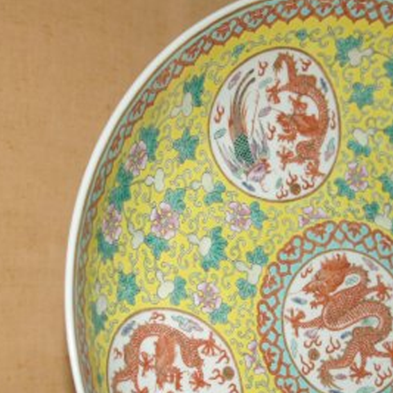清代是中国瓷器发展的又一高峰,粉彩瓷器在康熙晚期创烧,雍正、乾隆时期达到鼎盛,并在之后的清代中晚期持续发展。粉彩是在五彩的基础上,受珐琅彩制作工艺影响而创烧的一种釉上彩瓷,其特点是色彩柔和细腻、富有层次感。龙纹作为皇权的象征,在清代宫廷瓷器中极为常见,体现了封建等级制度。这类黄地粉彩龙纹盘不仅是实用的餐具或陈设器,更是兼具艺术价值和历史文化内涵的珍贵文物,反映了清代高超的制瓷工艺和独特的审美风尚。