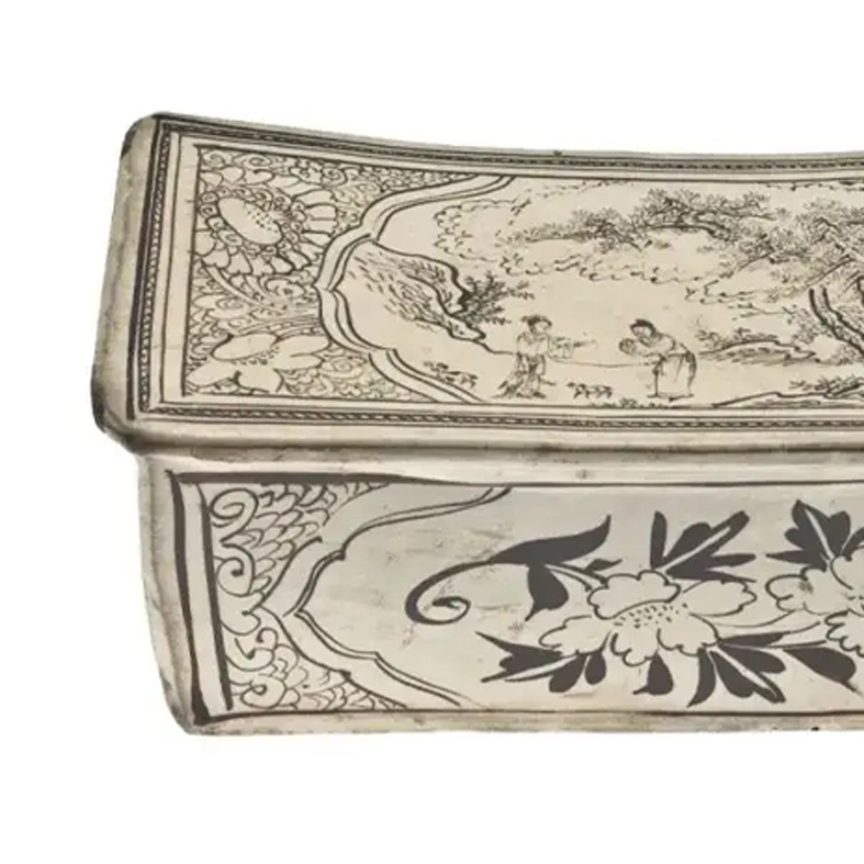 宋代是中国瓷器发展的黄金时代,名窑辈出,磁州窑是其中具有代表性的民窑体系。磁州窑以白地黑花装饰技法著称,其纹饰题材丰富,包括人物、动物、花卉、诗词等,具有浓郁的民间生活气息。瓷枕在宋代较为流行,不仅具有实用的寝具功能,同时也是一种装饰品和文化载体,反映了当时人们的生活方式、审美观念以及民间艺术的繁荣发展。