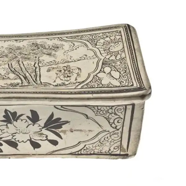 细节:枕面上绘有精美的人物故事图案,画面中有几个人物,或站立或活动,周围点缀有树木、山石等景物,人物神态生动,线条流畅,展现出宋代磁州窑工匠高超的绘画技艺。枕体侧面也装饰有花卉、卷草等纹饰,增加了器物的美观性。