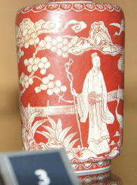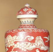 材质与色泽:胎体由瓷土烧制,质地细腻坚硬。外壁施矾红彩,色泽鲜艳浓郁,呈现出深沉的红色。采用留白技法描绘人物、景物等图案,红白对比鲜明,视觉效果突出。