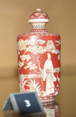 清代是中国鼻烟壶制作的鼎盛时期,各种材质和工艺的鼻烟壶层出不穷。瓷器鼻烟壶作为其中的重要品类,在装饰技法上不断创新,矾红彩是当时常用的彩料之一。留白技法能使图案在鲜艳的底色衬托下更加突出,常用于表现人物故事、花鸟山水等题材。鼻烟壶不仅是实用的器具,更是兼具艺术价值的工艺品,反映了清代工匠的高超技艺、当时的审美风尚以及社会文化生活的一个侧面。