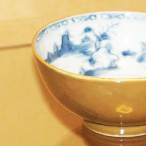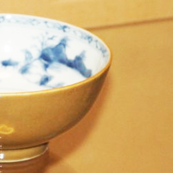 材质与色泽:胎体由瓷土烧制,质地细腻坚硬。碗外部施黄釉,色泽温润,呈现出一种古朴的黄色;碗内施白釉,以青花绘制山水图案,青花发色沉稳,蓝白对比鲜明,给人清新雅致之感。