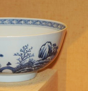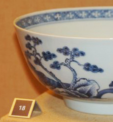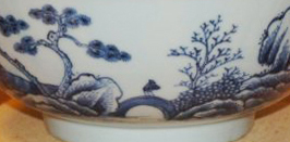 细节:碗壁绘有青花山水图案,描绘了松树、山石、小桥等景致,构图巧妙,笔触细腻,展现出中国传统山水画的意境。碗口沿处有一圈青花几何纹或花卉纹边饰,增加了器物的精致感。