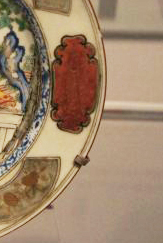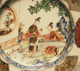 细节:盘心绘有一幅人物故事场景,可能描绘的是古代文人雅士的生活场景,人物形象生动,服饰细节丰富,神态各异。盘口沿处有一圈装饰带,间隔分布着红色的如意形开光,开光内绘有花卉等纹饰,开光之间以青花和其他色彩绘制卷草纹等,整体布局严谨,装饰精美,体现了清代瓷器高超的绘制工艺和装饰艺术。