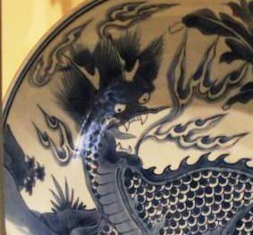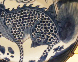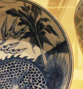 细节:盘心绘有一只栩栩如生的麒麟,麒麟身形矫健,身上布满鱼鳞状的鳞片,鬃毛飞扬,周围点缀着火焰纹、山石、棕榈树等纹饰,营造出一种威严而神秘的氛围。盘边缘有一圈青花装饰带,进一步增强了器物的美感和整体性,体现了明代青花瓷绘画技艺的高超和纹饰布局的严谨。