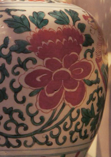 细节:罐身主体绘有花卉与鸟类图案,花朵硕大饱满,花瓣层次分明,枝叶舒展自然;鸟类姿态灵动,羽毛刻画细致。花卉与鸟类周围以卷曲的藤蔓纹作为装饰,线条流畅优美。罐口沿处有一圈红色火焰状纹饰,底部边缘也有红绿相间的条纹装饰,增加了器物的精致感和装饰性。