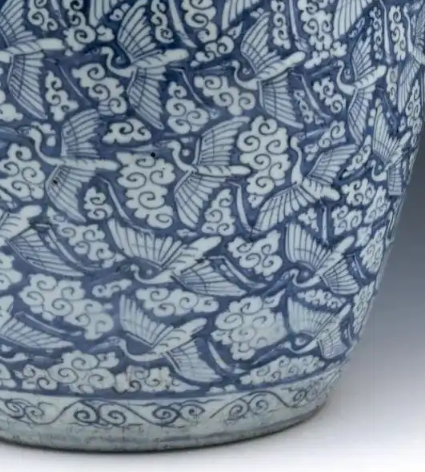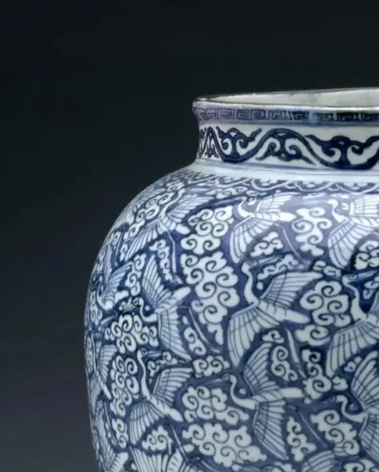 细节:罐身满绘云鹤纹,仙鹤姿态各异,或展翅飞翔,或引颈高歌,周围环绕着形态各异的云纹。云纹线条流畅,仙鹤形象生动,羽毛等细节刻画细致。颈部还绘有一圈装饰带,进一步增强了器物的美感和整体性,体现了明代青花瓷绘画技艺的高超和纹饰布局的严谨。