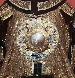 细节:甲衣胸前有圆形护心镜,周边装饰有精美的刺绣和珠宝。甲衣边缘及关键部位有黑色镶边,增加层次感。头盔上装饰有羽毛、金属饰品等,顶部可能是代表身份地位的装饰物。甲衣的腰部、下摆等部位还有兽头、云纹等金属或刺绣装饰,工艺极为精细。