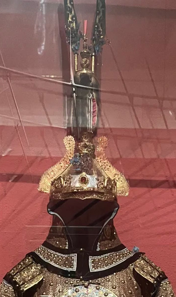 材质与色泽:甲衣主体部分为棕色的纺织品,上面布满金属甲片,泛着金属光泽。头盔部分以金属制成,搭配有金色、红色等色彩的装饰,显得富丽堂皇。