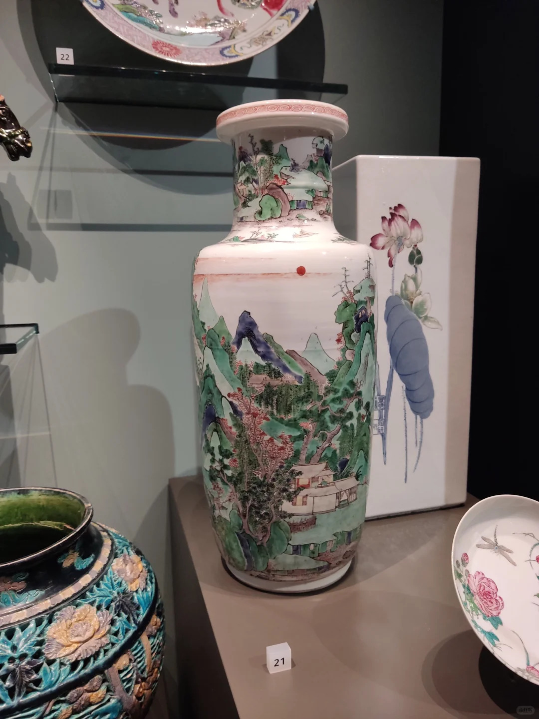 清代是中国瓷器发展的鼎盛时期,康熙、雍正、乾隆三朝尤为突出。五彩瓷器在明代五彩的基础上进一步发展,工艺达到了很高的水准。棒槌瓶是康熙时期创新的瓷器造型之一,深受市场欢迎。山水题材是中国传统绘画和瓷器装饰的重要主题,体现了人们对自然的热爱和对宁静生活的向往,也反映了清代高超的制瓷工艺和独特的审美风尚。