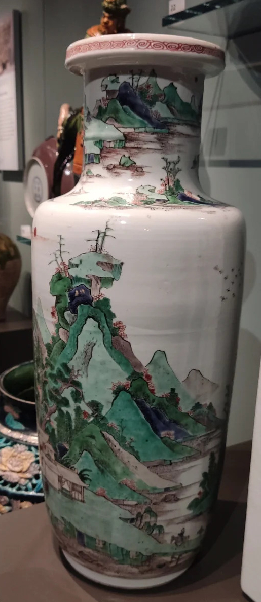 近代中国在列强侵略下,社会秩序遭到严重破坏,文物保护体系几乎崩溃。第二次鸦片战争、八国联军侵华战争等期间,列强对中国的宫殿、王府以及民间收藏进行了大规模掠夺。同时,清末至民国时期,文物非法交易盛行,大量文物被走私到国外。这件五彩山水纹棒槌瓶可能就在此时被掠夺或通过非法渠道贩卖到英国,最终被苏格兰国家博物馆收藏。