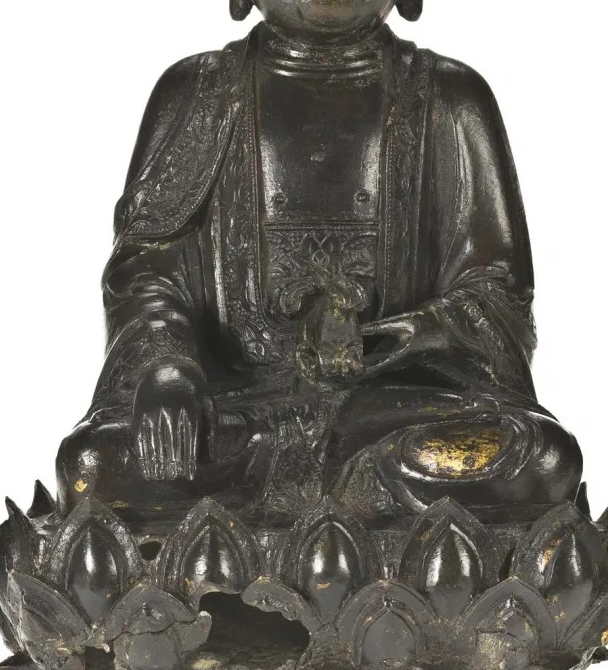 细节:头顶有螺发,发髻上似有装饰物;双耳较大且垂,符合佛教造像的典型特征。身着袈裟,衣纹线条简洁流畅,生动表现出衣物的质感和垂坠感。左手置于膝上,右手结触地印(或持有法器 )。莲花座雕刻细致,莲瓣饱满,形态优美,起到稳固和装饰佛像的作用。