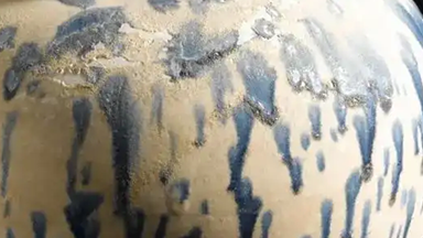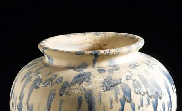 细节:口沿部分略微粗糙,显示出手工制作的痕迹;罐身的蓝彩与白釉交界处,色彩过渡自然,蓝彩部分有流淌晕散的效果,增添了器物的生动性。