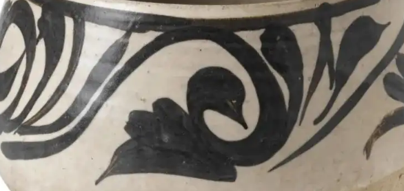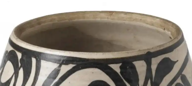 细节:罐身以黑彩绘有卷草纹,卷草纹线条流畅自然,富有动感,展现了磁州窑工匠熟练的绘画技巧。纹饰布局疏密得当,给人以简洁明快之感。口沿和底部未施满釉,露出原始的胎体,这也是磁州窑瓷器常见的特征。