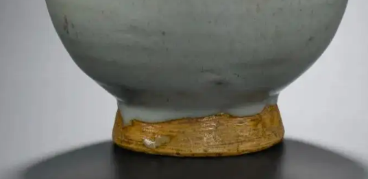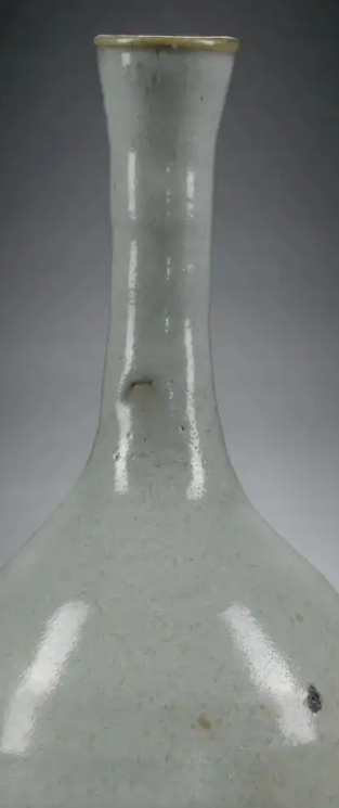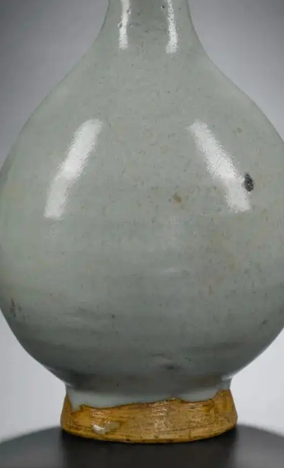 材质与色泽:胎体由瓷土烧制而成,质地较为厚重。瓶身施钧釉,釉色呈现出淡雅的灰蓝色,带有自然的窑变效果,釉面有一些细小的开片,增添了古朴的韵味。底部圈足处未施满釉,露出淡黄色的胎体。