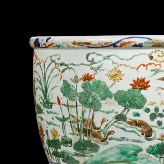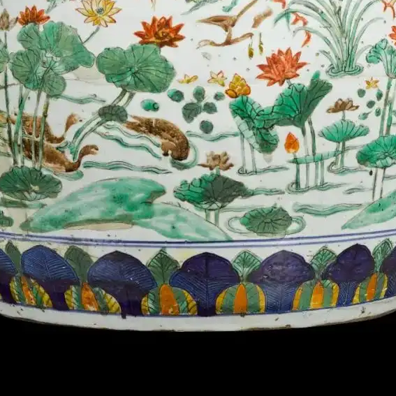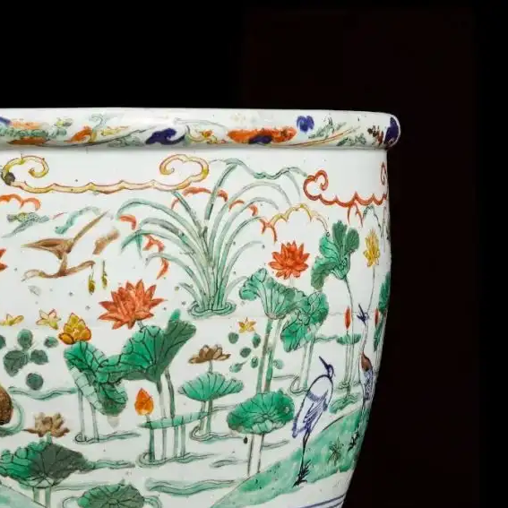 细节:口沿处有一圈装饰边,增添了器物的精致感。缸身主体以五彩描绘莲池景色,荷花姿态各异,有的含苞待放,有的盛开绽放;荷叶或舒展或卷曲,形态生动;其间穿插着水鸟、游鱼等,栩栩如生,充满生机。底部装饰有一圈莲瓣纹,线条流畅,图案规整,与主体纹饰相呼应。