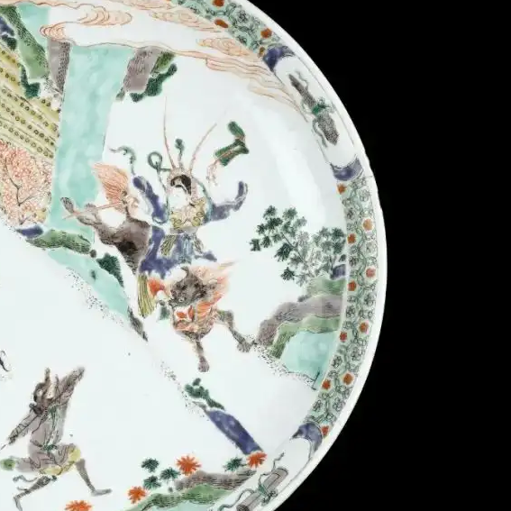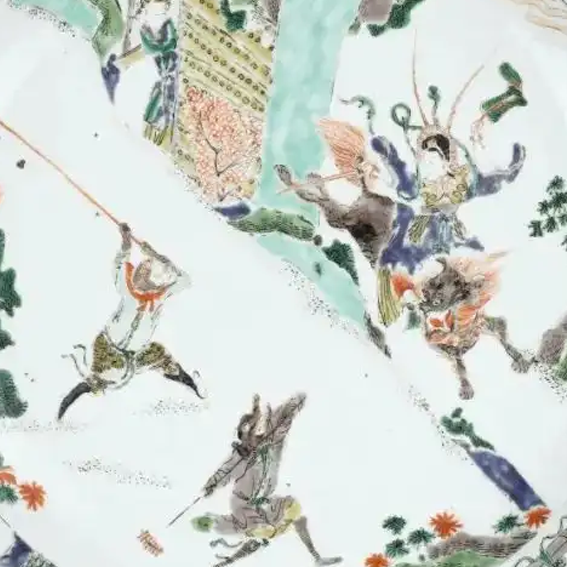 清代康熙年间,社会稳定,经济繁荣,手工业发展达到新高度,景德镇制瓷业迎来鼎盛。康熙五彩在明代五彩的基础上进一步发展,工艺更加成熟,色彩运用更为自如。《西游记》作为中国古典文学名著,在民间广泛流传,深受各阶层喜爱,其故事题材被大量运用在瓷器装饰上,反映了当时文学艺术对陶瓷装饰的影响,以及民众对文化娱乐的追求。同时,康熙时期对外贸易发达,瓷器作为重要的出口商品,这类绘有中国传统文化故事的瓷器也随着贸易流传到世界各地,促进了中外文化交流。