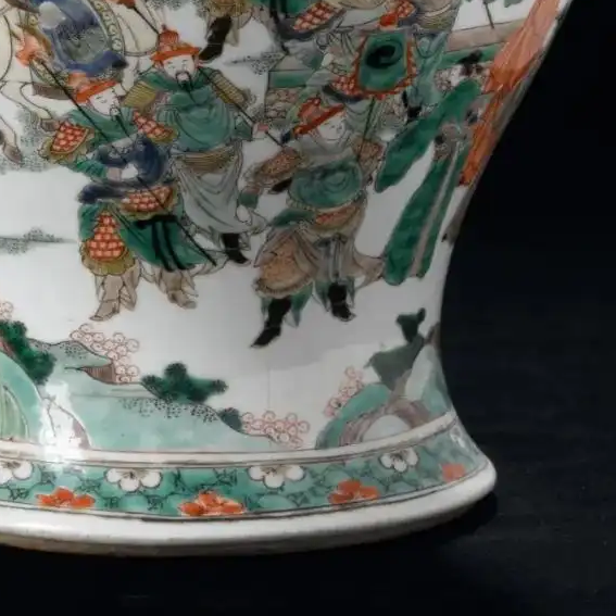 清代康熙年间,社会趋于稳定,经济繁荣,手工业发展迅速,景德镇的制瓷业达到了鼎盛阶段。康熙五彩是在明代五彩的基础上发展而来,工艺更加成熟,色彩运用更加娴熟。这一时期,人们对文化娱乐的需求增加,历史故事、神话传说等题材广泛应用于瓷器装饰中,既满足了民众对文化的追求,也反映了当时的社会价值观和审美情趣。将军罐作为一种重要的陈设瓷和储物器具,在宫廷和民间都有广泛使用,其精美的装饰体现了康熙时期高超的制瓷技艺和繁荣的陶瓷文化,同时也是中外文化交流中中国瓷器艺术传播的重要载体。