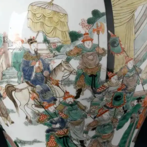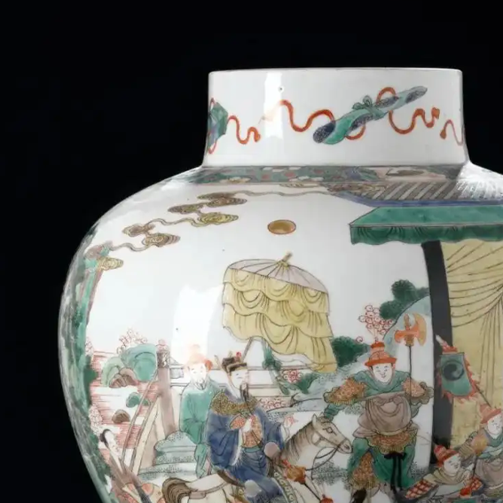 细节:罐身以五彩描绘人物故事场景,人物众多,形象各异,穿着不同的服饰,姿态动作丰富,或骑马,或站立,或交谈,展现出故事中的情节和氛围。人物周围点缀有亭台楼阁、树木山石、旗帜等元素,构图饱满,布局合理,绘画笔触细腻,线条流畅,将人物的神态和场景的细节都刻画得栩栩如生。颈部和底部边缘装饰有精美的花纹,增加了器物的装饰性和精致感。
