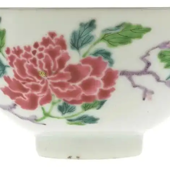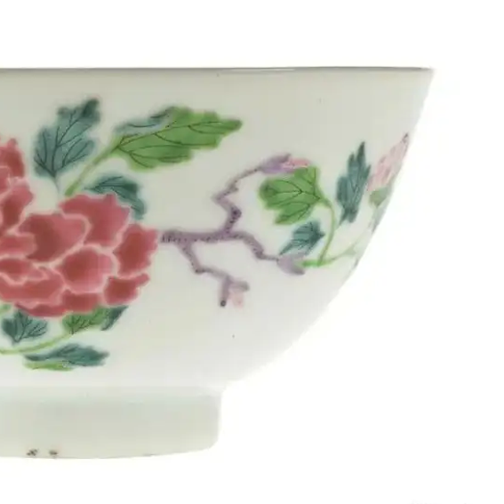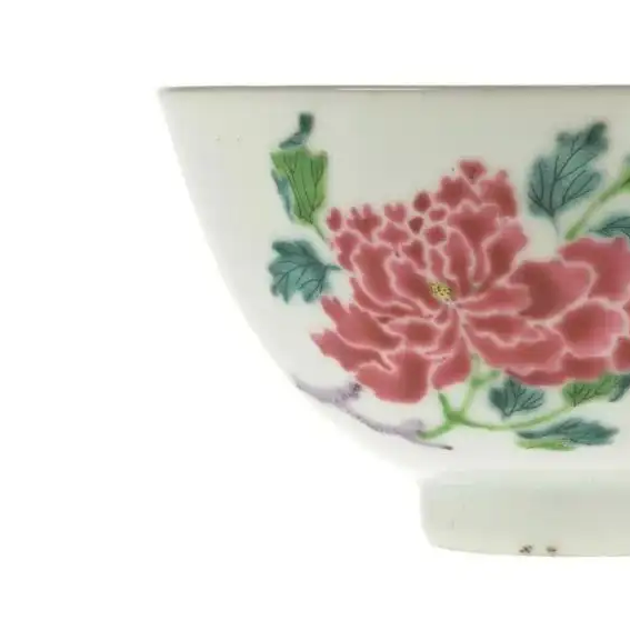 细节:碗外壁以粉彩描绘花卉图案,花朵形态逼真,牡丹花瓣层层叠叠,尽显雍容华贵之态;枝叶的线条流畅,叶脉清晰可见,展现出勃勃生机。绘画笔触细腻,能够将花卉的神韵生动地表现出来。圈足处修胎规整,底部露胎处可见胎质细密,呈现出自然的火石红现象。