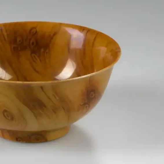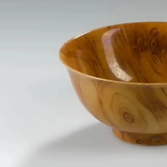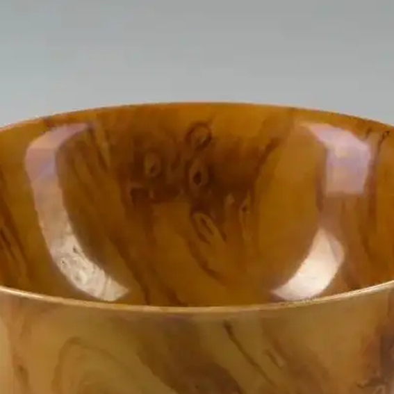 材质与色泽:胎体由细腻的瓷土烧制而成,质地坚硬。通过特殊的釉色和烧制工艺,使碗的表面呈现出逼真的木纹效果。整体色泽呈现出类似木材的棕黄色调,纹理自然流畅,有深浅变化,仿佛是由真实木材制成,展现出高超的仿生瓷制作技艺。