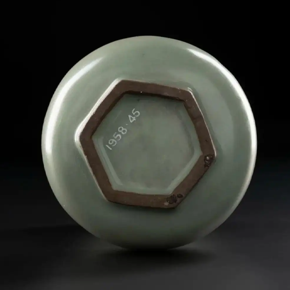 细节:瓶口边缘釉层较薄,呈现出淡淡的 “紫口” 现象;底部六边形圈足露胎,胎色较深,有类似 “铁足” 的特征,模仿宋代官窑瓷器的典型特征。弦纹线条规整,凹凸有致,在釉色的映衬下,更显古朴韵味。