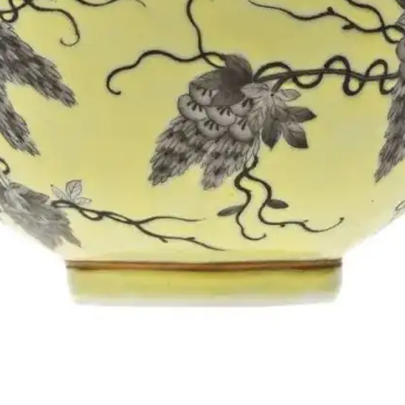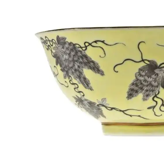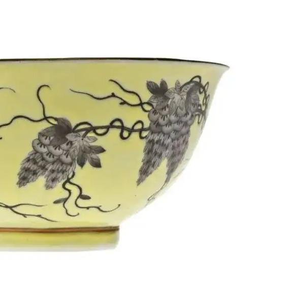 材质与色泽:胎体由细腻的瓷土烧制而成,质地坚硬。碗外壁施淡黄色釉,色泽均匀柔和,给人温馨之感。以墨彩描绘葡萄及藤蔓图案,墨色浓淡相宜,与黄釉底色形成鲜明对比,视觉效果独特。