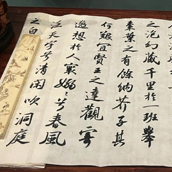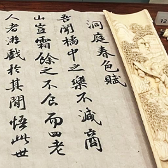 细节:文字内容为古文赋体,从开头可见 “洞庭春色赋” 字样,字体应为行书或楷书,笔画流畅或规整,字的大小、间距较为均匀,体现出书写者有一定的书法功底。作品两侧伴有牙质雕刻的物品,可能是镇纸。