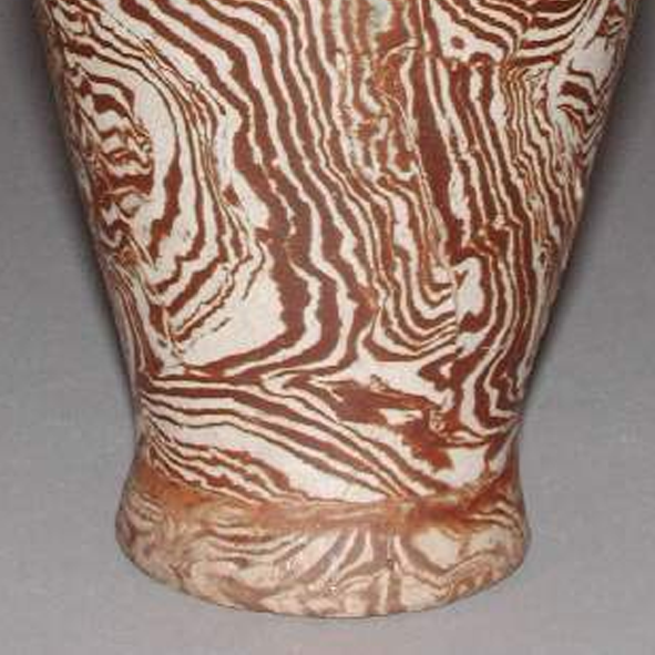 细节:瓶口较小且微微外撇,颈部较短,与丰腴的肩部形成鲜明对比。瓶身的绞胎纹理自然流畅,没有完全相同的图案,每一处纹理都是独一无二的,展现了宋代工匠高超的制瓷技艺。底部圈足处理规整,体现了当时成熟的制瓷工艺水平。