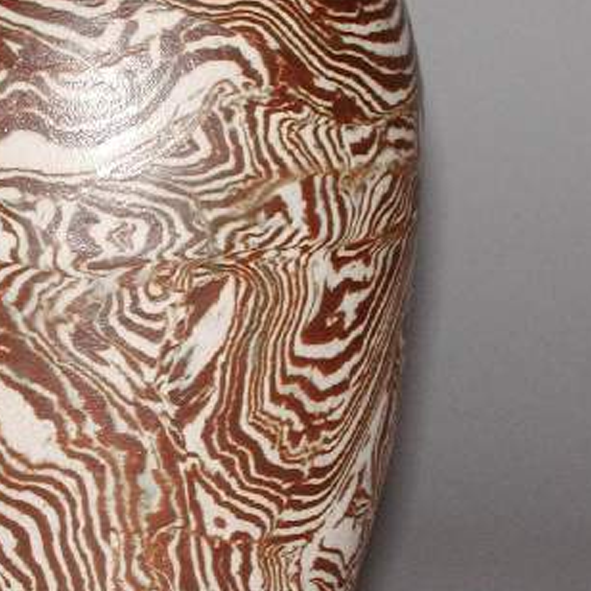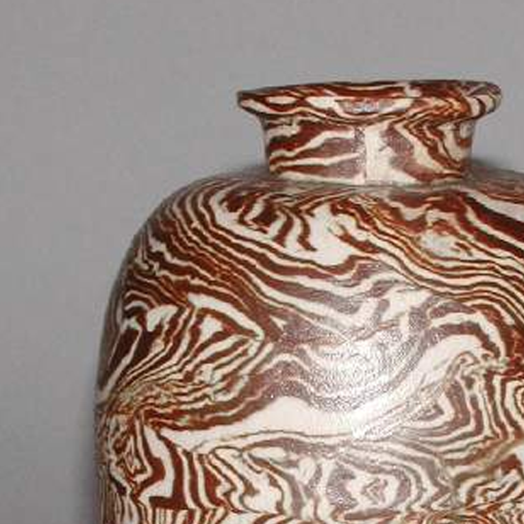 材质与色泽:主要由瓷土制成,表面呈现出棕白相间的纹理,色彩对比鲜明。棕色与白色相互交织,形成自然且富有变化的花纹,如同天然的大理石纹理,给人一种质朴而又雅致的美感。