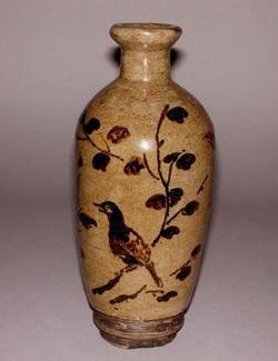 材质与色泽:胎体为瓷土烧制,瓶身底色呈米黄色,表面施有透明釉,釉面有一定的光泽度,但因年代久远,略显温润古朴。瓶身以黑褐色颜料绘制花鸟纹饰,色彩对比鲜明。