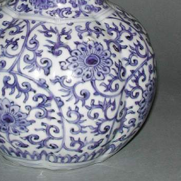 细节:瓶身满绘青花缠枝莲纹,莲花形态优美,花瓣舒展,缠枝线条婉转流畅,富有动感,将整个瓶身装点得繁而不乱。颈部和上下球体的衔接处等部位,还饰有辅助纹饰,增加了装饰的层次感和丰富性。纹饰绘制精细,笔触细腻,体现了明代工匠高超的制瓷技艺和绘画水平。