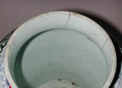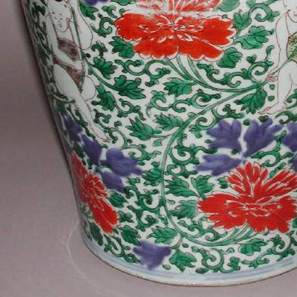 材质与色泽:罐体瓷质细腻,胎体厚重。釉面洁白莹润。五彩颜色丰富,以红、绿、蓝、紫等彩料为主,色彩对比强烈。红色的牡丹、绿色的枝叶、蓝色的背景相互映衬,营造出热闹喜庆的氛围;婴孩形象以白描为主,与艳丽的花卉色彩形成鲜明对比。木盖呈深棕色,镂雕部分纹理清晰。